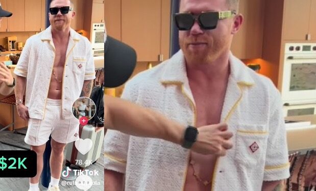 En el video Canelo Álvarez presumió que sus sneakers Alexander McQueen tienen un valor de mil dólares, después un conjunto de pantalón corto y camisa de Casablanca París, que tiene un valor de 4 mil dólares.