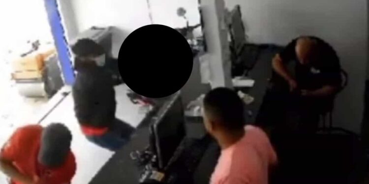 Después de unos segundos, se ve como entra un sujeto con sudadera y gorra en color negro, así como un cubrebocas y comienza a disparar de manera directa en contra del otro hombre que estaba sentado detrás del mostrador y el cual se encontraba viendo su celular.