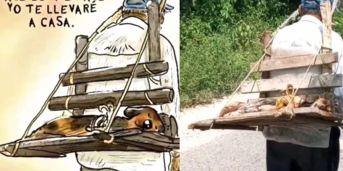 La solución ingeniosa que encontró este tierno abuelito para superar esta dificultad resalta su compromiso y amor incondicional hacia su perrita. Utilizando madera y mecates, construyó una base de transporte improvisada que le permitió llevar a su mascota inconsciente consigo mientras la sostenía en su espalda e incluso la ataba a su cabeza.