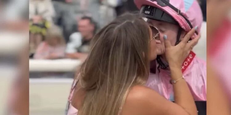 El jockey ganador del Ebor Festival, Sean Kirrane, recibe un beso de Jolene De’Lemos propietaria del Caballo