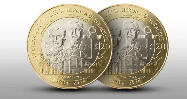 Mientras que en su reverso luce las efigies de los cadetes Virgilio Uribe y José Azueta, defensores civiles del puerto de Veracruz, así como el edificio de la Escuela Naval Militar debajo y un ancla en el costado derecho.