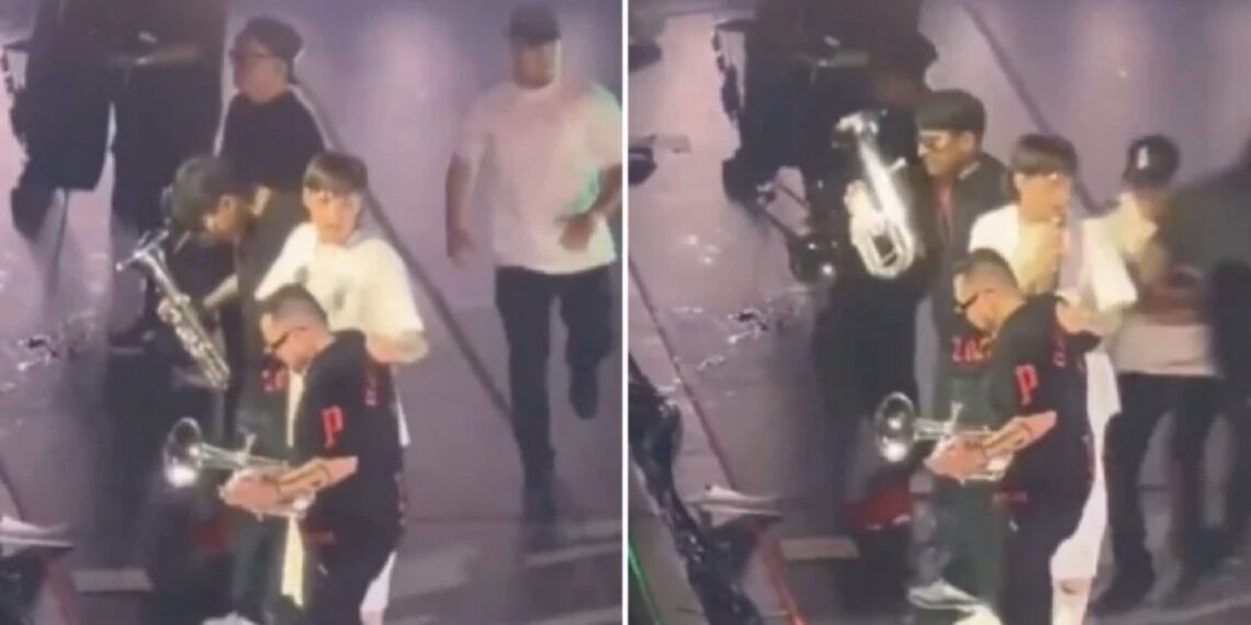 Durante esta intervención, se puede apreciar como algunos de los músicos también sufren una caída y Peso Pluma voltea sorprendido al no saber lo que estaba sucediendo.