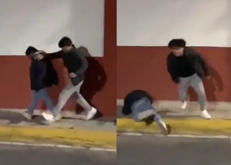 El joven le mete el pie hasta que cae y se lleva un fuerte golpe en la cabeza contra la banqueta, la víctima trató de levantarse del suelo para ver a sus agresores, pero en ese momento emprenden la huida y salen corriendo del lugar.