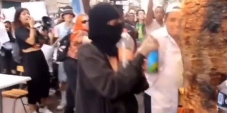 La mujer, en un acto inexplicable, roció pintura sobre el trompo de pastor en una taquería, provocando la pérdida total de la carne y obligando al establecimiento a desechar el producto. A pesar de los intentos de los empleados por detener la acción, más mujeres encapuchadas se unieron al acto vandálico, generando indignación tanto en el lugar como en las redes sociales.