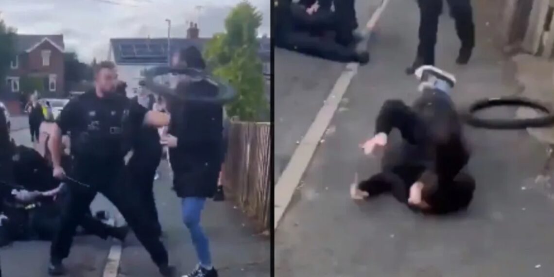 Durante el enfrentamiento, un neumático parece surgir de la nada, aparentemente lanzado por un vecino hacia un policía, pero golpea a la mujer, dejándola inconsciente de inmediato.
