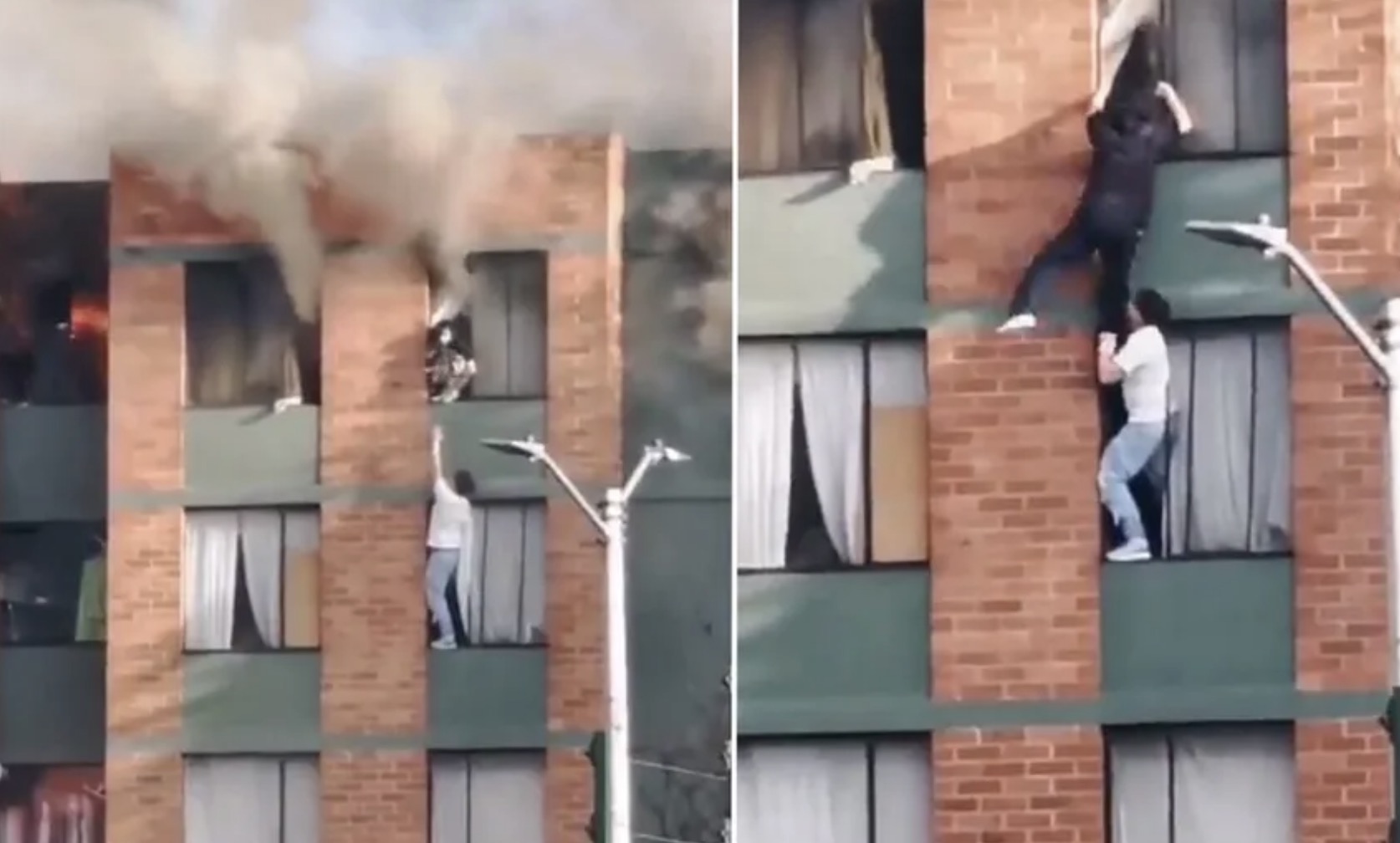Colombia.-Una joven y su perrito fueron rescatados de un incendio en su apartamento por vecinos del mismo edificio en Bogotá, Colombia, antes de que estos fueran consumidos por el fuego, un hecho heroico que quedó registrado en un video.