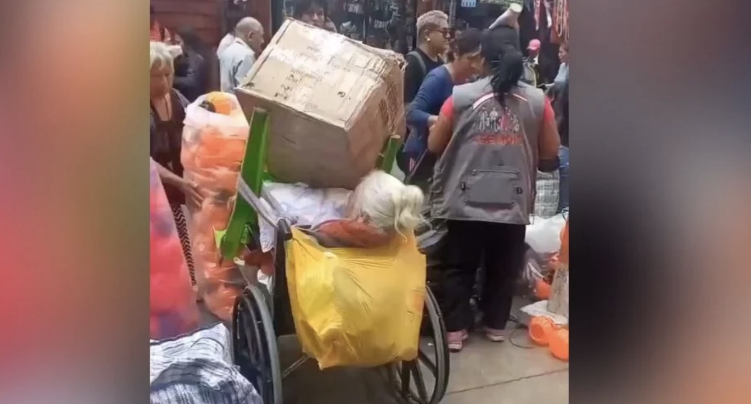 A pesar de que el video no dice mucho, se puede apreciar cómo la silla de ruedas donde se encuentra la mujer es usada para cargar cosas, sin importar que ella esté ahí sentada.