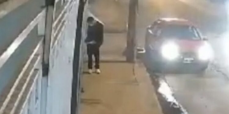 En las imágenes de las cámaras de seguridad, se aprecia a un hombre descender de un automóvil rojo con la intención de activar un artefacto explosivo cerca de un local comercial.