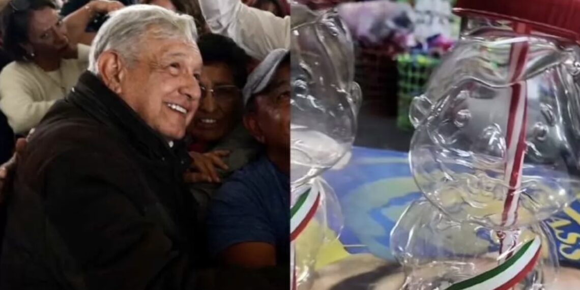 Sí, así como lo lees, este “novedoso” producto es una botella con la figura del “Amlito”, o sea de la imagen caricaturizada de López Obrador, acompañada de una mini cinta presidencial.
