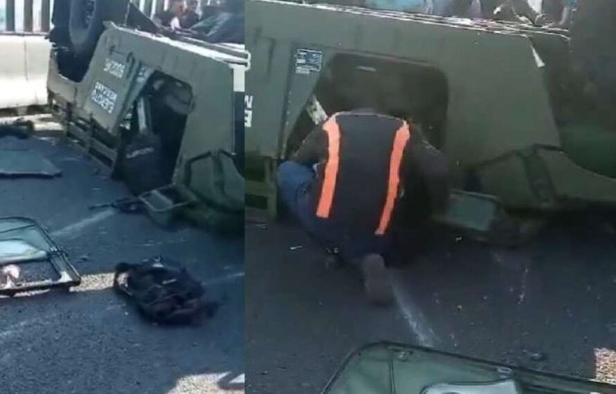 En un video que circula en redes sociales y se hizo viral, se puede observar a la unidad del Ejército totalmente llantas para arriba, mientras varios vecinos, automovilistas o personas que pasaban por el lugar tratan de enderezar el vehículo, al igual que asisten a los militares lesionados.