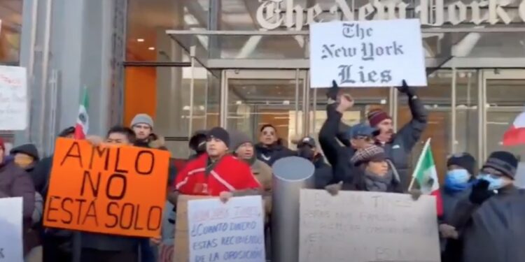 A través de varios videos publicados en redes sociales es posible observar a personas migrantes en la puerta principal de las instalaciones del The New York Times, sosteniendo pancartas con las frases “The New York Lies” y en conjunto gritando la consigna de “AMLO no estás solo”.
