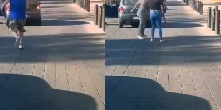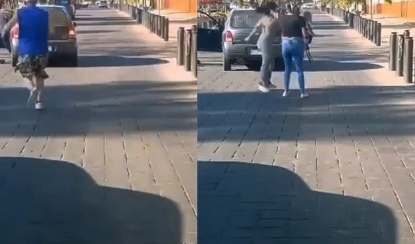 Sosteniendo con una mano al bebé y con la otra empieza a jalonear a la mujer. Segundos después la del chevy intenta alejarse y es cuando la “dama” con el niño la alcanza, la jalonea del cabello y logra derribarla, en su apoyo llega el de la camiseta azul.