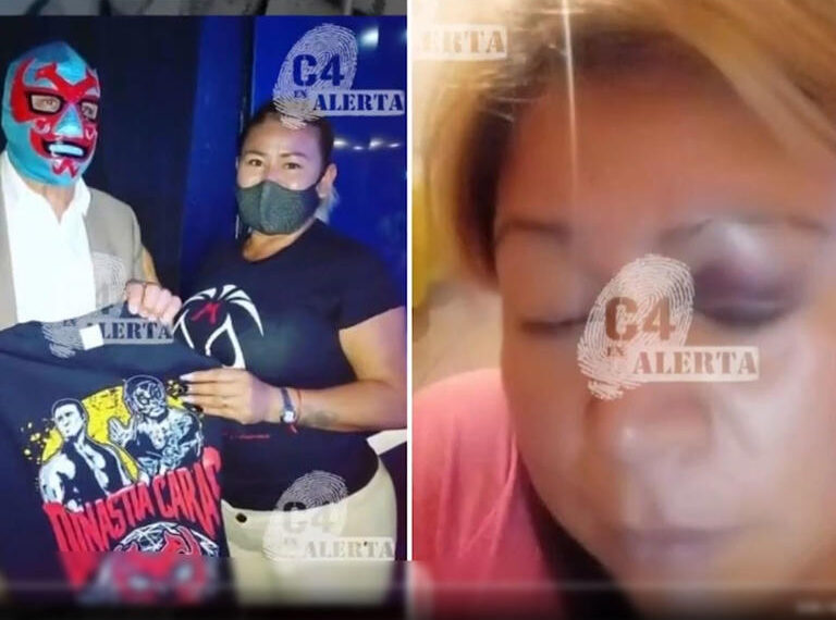 En videos subidos a las redes sociales del periodista Carlos Jiménez se muestra cómo la mujer enseña varios golpes que presuntamente le propinó el ex luchador.