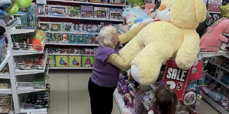 EU.-Un empleado que trabajaba en una tienda de juguetes decidió cambiar el precio a un gran oso de peluche con el fin de que una abuelita con su nieta se lo pudiera llevar.