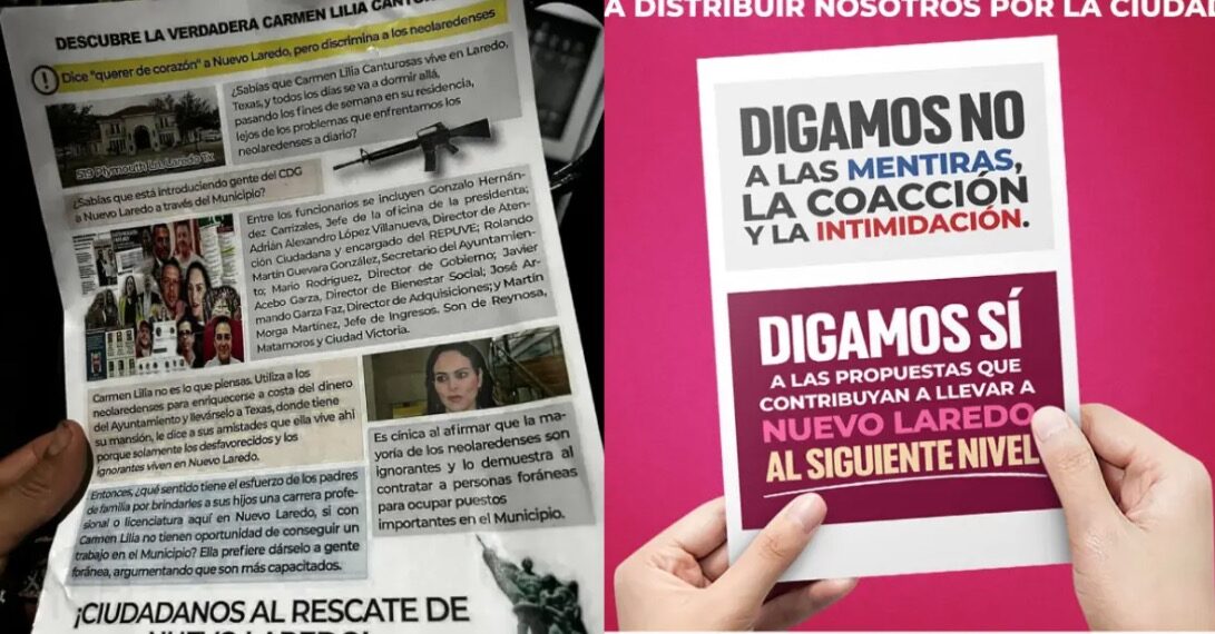 Durante el fin de semana en diversas colonias de Nuevo Laredo, Tamaulipas, se difundieron cientos de folletos que vinculan a la candidata de la coalición “Sigamos haciendo historia” a la alcaldía, Carmen Lilia Canturosas Villarreal, con el crimen organizado, lo que es una escala en la violencia electoral en el municipio fronterizo.