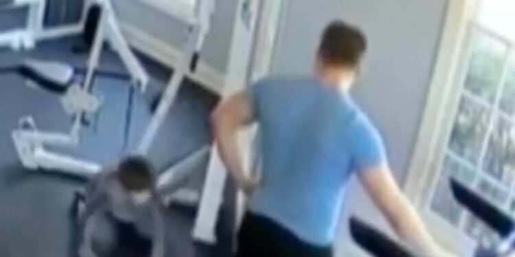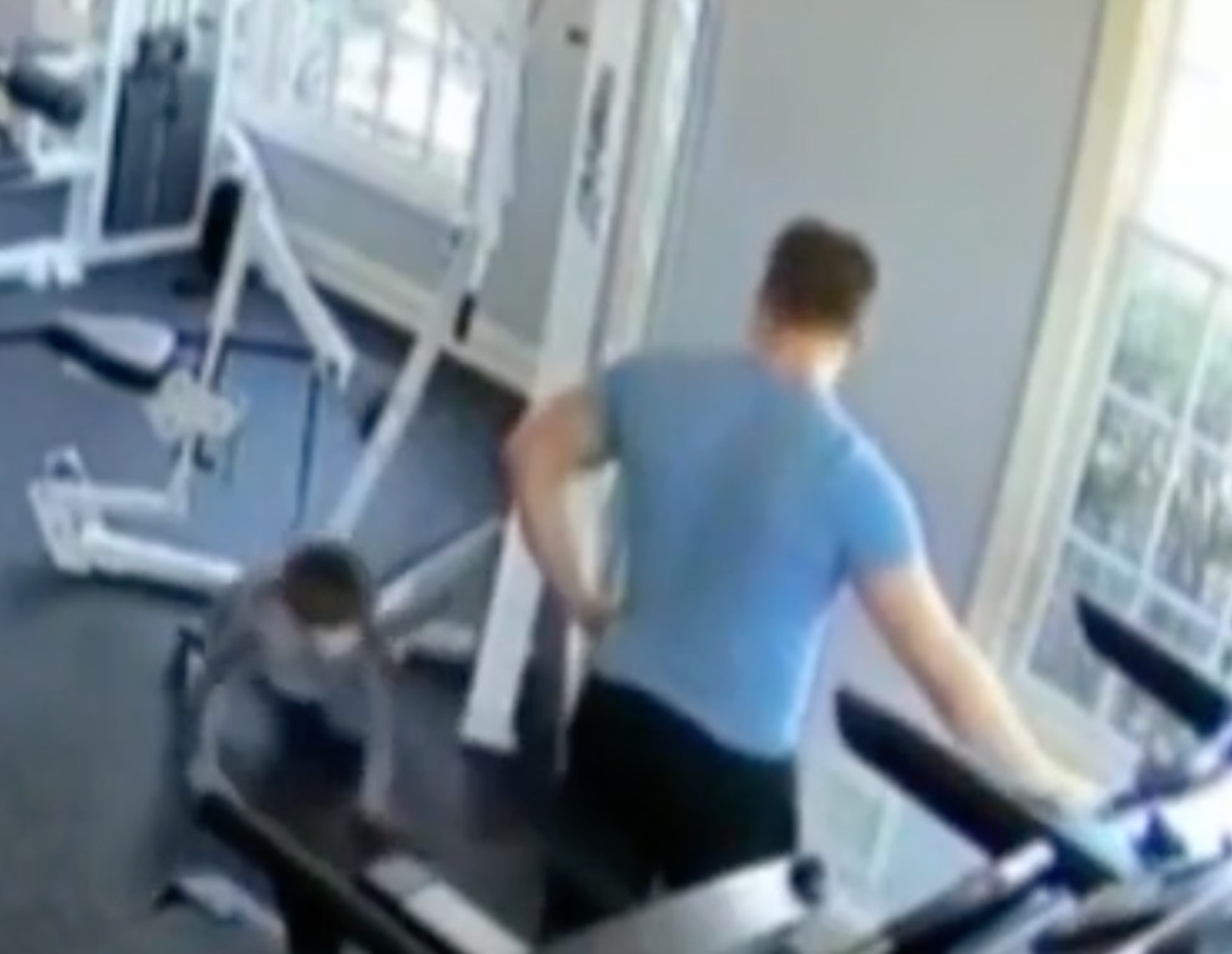 A continuación, se ve cómo Gregor levantó a su hijo, que luchaba por mantenerse en pie, y lo obligó a volver a subir a la caminadora. Mientras lo sostenía, el padre parece “morderlo”, tal como se indicó en la orden de detención, en la parte superior de la cabeza, antes de disminuir la velocidad y la inclinación de la máquina.