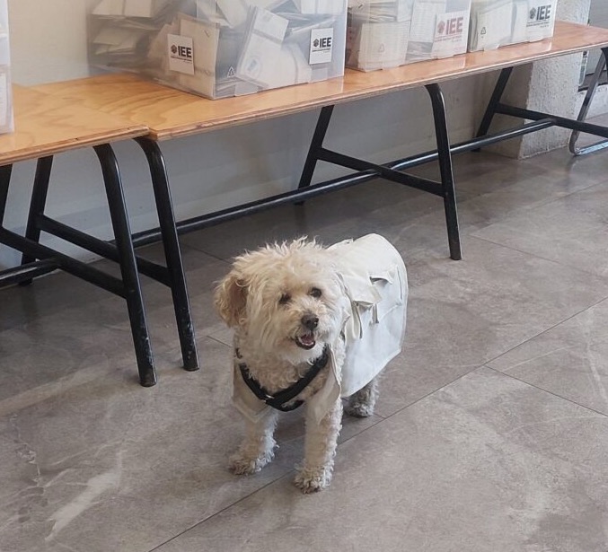 En los videos que circulan en la red, se puede ver a la pequeña Daisy, de color blanco, luciendo su chaleco que la identifica como funcionaria de casilla, mientras observa con atención y ternura a los votantes.