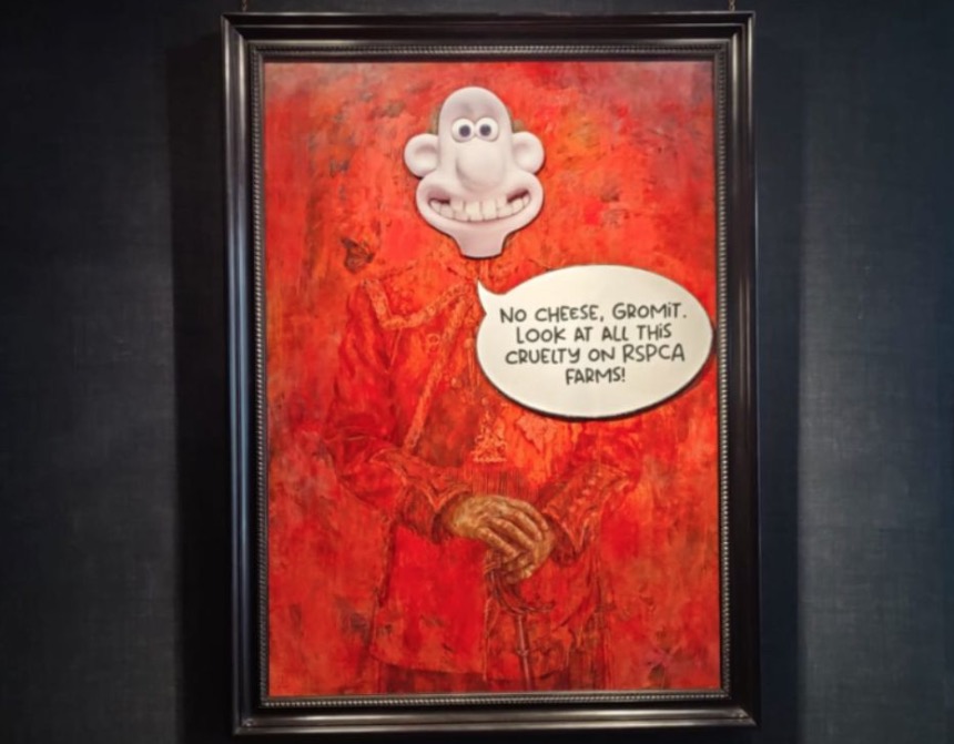 Los activistas de ‘Animal Rising’ cubrieron la cara de Carlos III con la del personaje de dibujos animados británicos Wallace, de la serie cómica ‘Wallace y Gromit’, y junto a ella colocaron el texto que denuncia la crueldad animal de RSPCA: