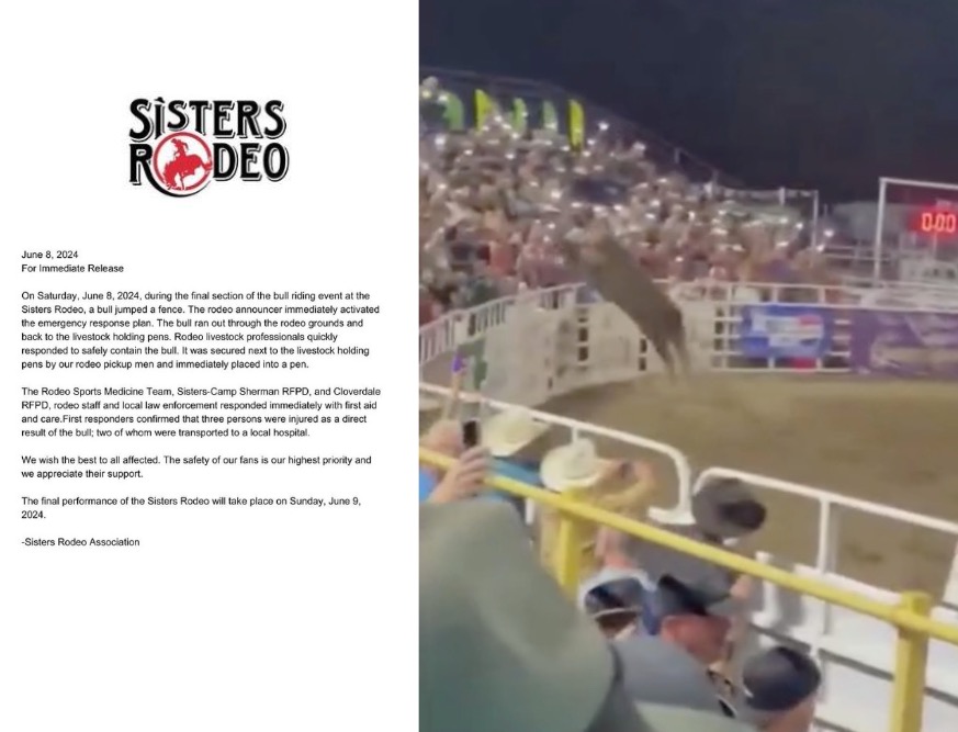 En un comunicado, la Asociación de Sisters Rodeo confirmó que tres personas resultaron lesionadas, dos de las cuales fueron hospitalizadas. En dicho documento también afirman que inmediatamente activaron los protocolos necesarios para contener al toro.