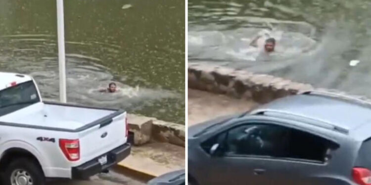 Un hombre, en aparente estado de alteración, fue visto dentro de la laguna, rodeado de cocodrilos. En el video que circula, se observa cómo uno de los reptiles se acerca… pic.twitter.com/OBkAmgXx9u