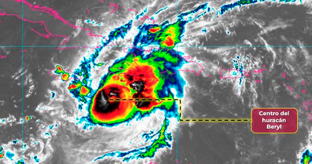 México.-El centro del huracán Beryl de categoría 4 en la escala Saffir-Simpson, se localiza en la región central del Mar Caribe y mantiene su rápido desplazamiento hacia el oeste-noroeste con trayectoria hacia la Península de Yucatán.
