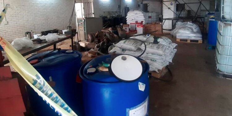 Se encontraron grandes cantidades de productos químicos utilizados en la fabricación de drogas ilícitas, como acetona, y metanfetamina con un valor estimado en la calle de 2,000 millones de rands (109,5 millones de dólares), según el comunicado.