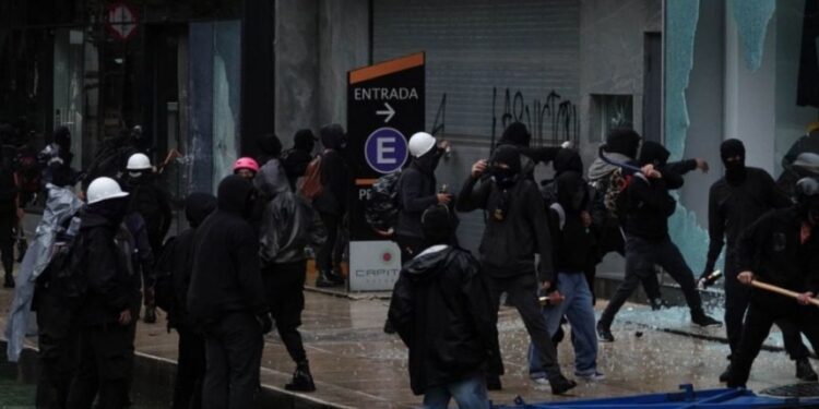 Uno de los primeros actos de violencia que se registraron en la manifestación fue el de un grupo de hombres, todos vestidos de negro y con el rostro cubierto, quienes destruyeron un establecimiento comercial, rompieron vidrios y saquearon productos comerciales, lo que generó momentos de tensión.