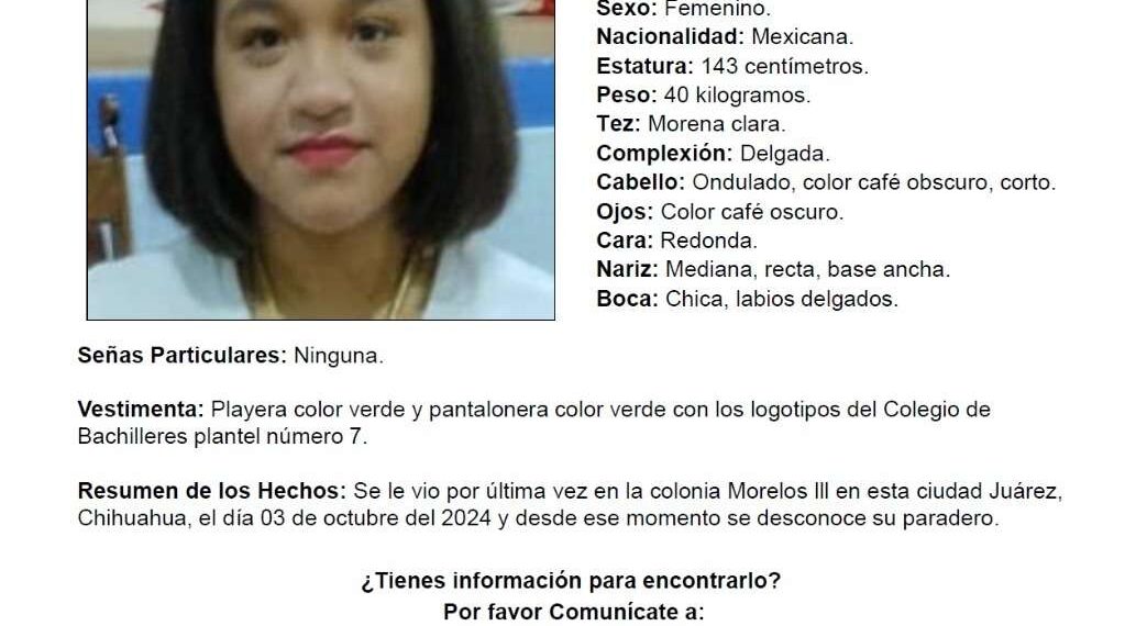 Ciudad Juárez.- Autoridades y familia buscan a una jovencita de 16 años quíen desapareció el pasado 3 de octubre en la Colonia Morelos lll, se solicita el apoyo de la comunidad para encontrarla.