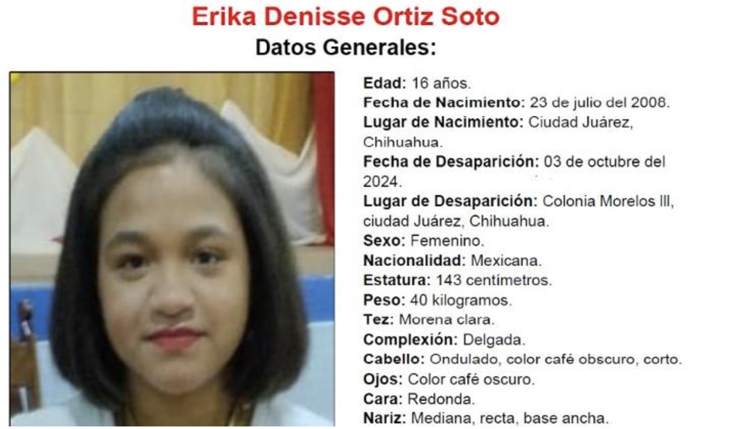 Erika Denise Ortiz Soto nació el 23 de junio de 2008, mide 143 centímetros, pesa 40 kilogramos es morena y tiene cabello ondulado.