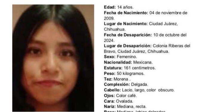 Ciudad Juárez.- La Fiscalía de Chihuahua emitió una pesquisas para dar con el paradero de una adolescente con nombre Denis Michelle Luna Martínez de 14 años de edad quien desapareció el 10 de octubre de Riberas del Bravo.