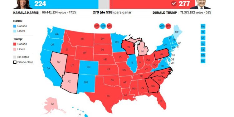 Obtiene 277 delegados (la mayoría está en 270) frente a los 224 de Kamala Harris, con una victoria contundente, aunque faltan los votos en otros cinco Estados. Trump se ha adjudicado el triunfo en 27 territorios frente a las 19 plazas que obtiene la vicepresidenta, entre ellas Nueva York, California, Illinois y Minnesota. Trump ha celebrado su victoria con una fiesta en West Palm Beach, en Florida, en la que ha comparecido tres horas antes del resultado definitivo. Allí, ha proclamado: “Vamos a arreglar todo lo que está mal en este país”.