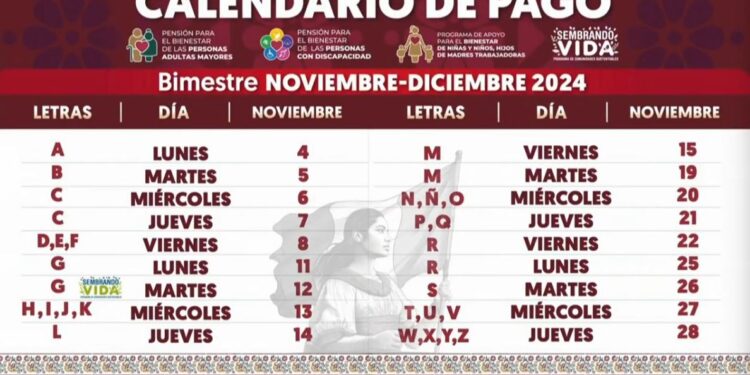 Tal y como se dijo antes, la Pensión Bienestar para Adultos Mayores se entrega conforme a un calendario ordenado conforme a la inicial del apellido paterno de los beneficiarios, el cual, quedó establecido de la siguiente manera para la semana del lunes 11 al viernes 15 de noviembre: