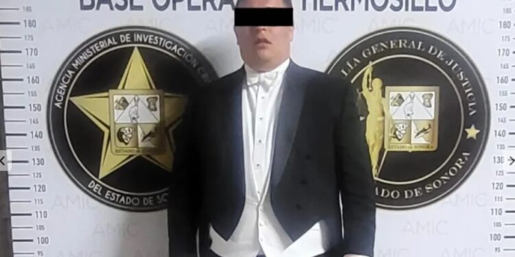 Vestido con esmoquin negro y tenis, Manuel Raymundo posó para la foto oficial de su presentación como detenido, que la misma Fiscalía de Sonora difundió en redes sociales el lunes 11 de noviembre de 2024.