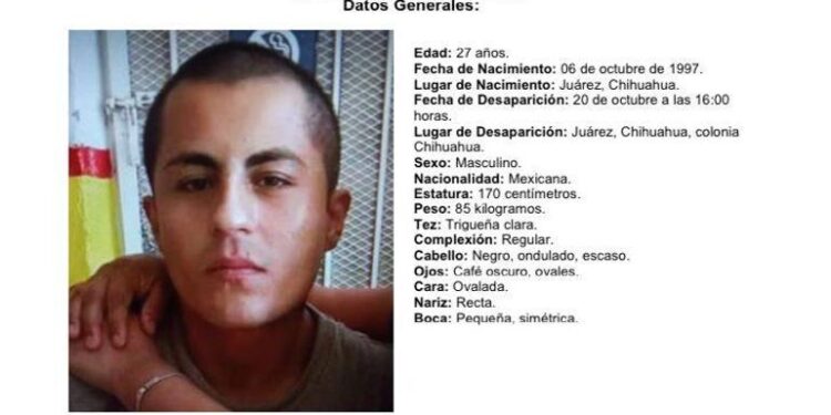 Ciudad Juárez—Familia y La Fiscalía General del Estado (FGE) pide la colaboración de los ciudadanos para poder localizar a Brian Israel Fortuna Salas de 27 años, desaparecido desde el pasado 20 de octubre en esta frontera.