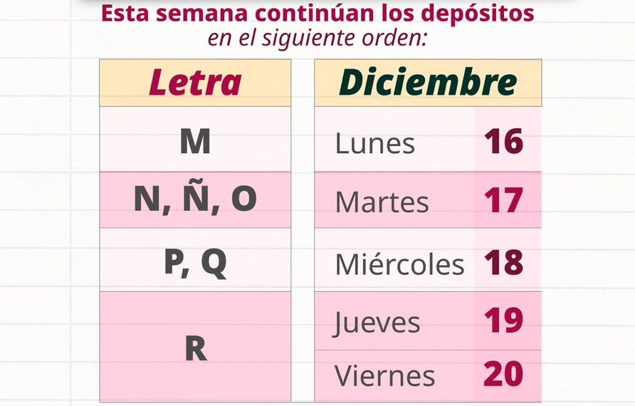 Al respecto, compartió el calendario de pagos, en el cual se indica quiénes serán las y los beneficiarios que recibirán su pago doble, equivalente a dos bimestres, durante la semana del lunes 16 de diciembre al viernes 20 de diciembre: