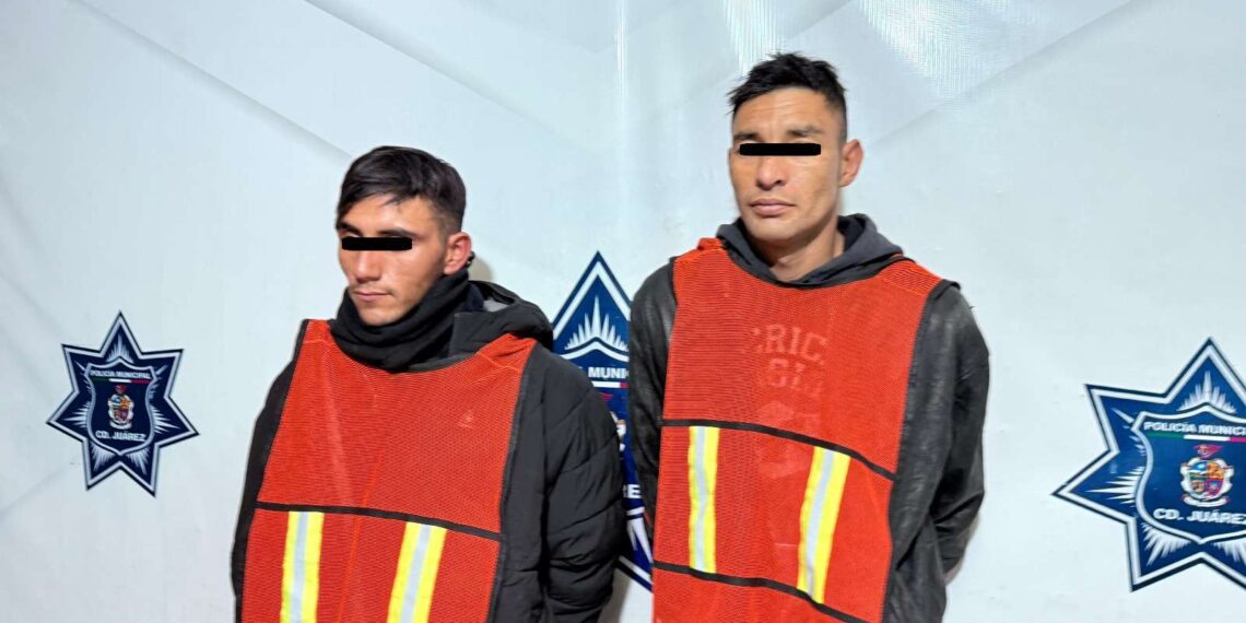 Ciudad Juárez .- Elementos de la Secretaría de Seguridad Pública Municipal arrestaron a Juan Ramón S. R. y Edgar Lorenzo F. E., por su presunta responsabilidad en la comisión del delito de robo en grado de tentativa y daños.