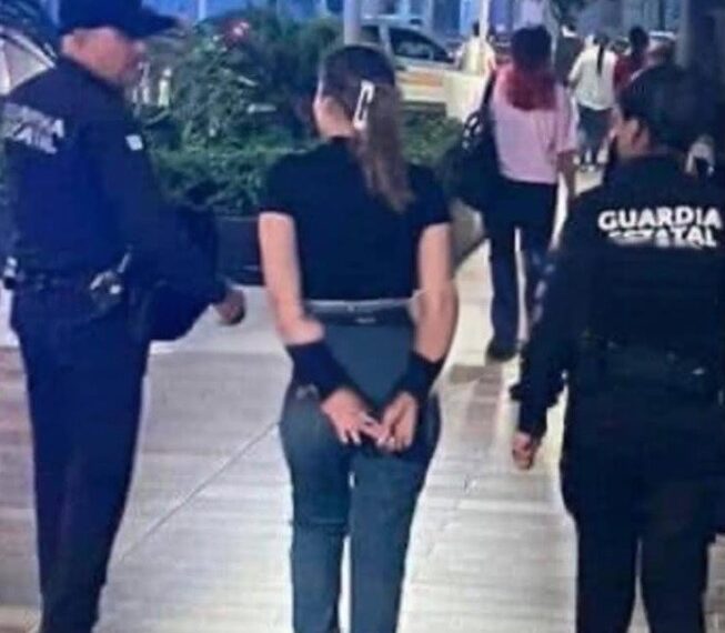 Según testigos, elementos de seguridad privada la entregaron a la Guardia Estatal, quienes la trasladaron esposada a la barandilla municipal por supuesto robo a una tienda de ropa ubicada en el mencionado centro comercial.