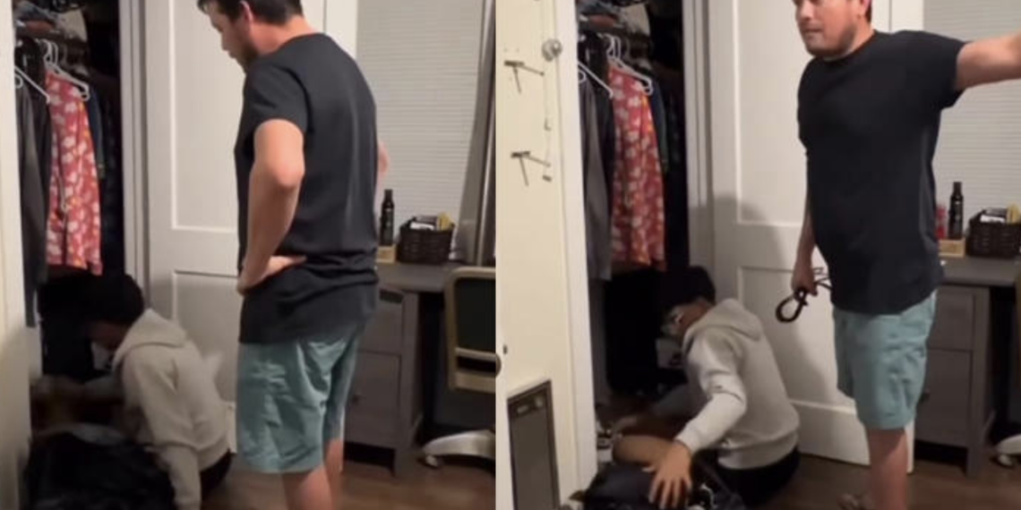 Con un cinturón en mano, el padre se dirige a su hijo y le da una lección que no olvidará fácilmente.