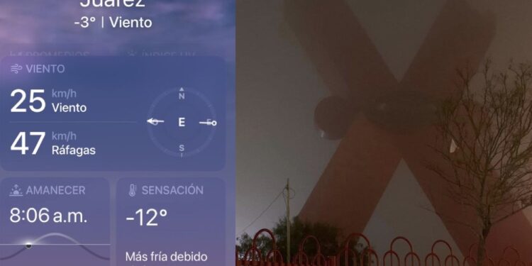 Ciudad Juárez.-Ciudad Juárez está experimentando una ola de frío extremo debido al Frente Frío 21 y la segunda tormenta invernal. Las temperaturas han descendido hasta -5 °C, con posibilidades de nieve y aguanieve en la región, en estos momentos la temperatura es de -4 grados y una sensación térmica de -12 grados.