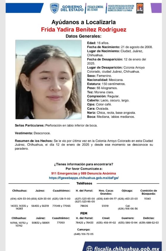 Padre busca a su hija Frida Yadira Benítez Rodríguez de 16 años quien desapareció este domingo 12 de enero del 2025 en la colonia Arroyo Colorado.