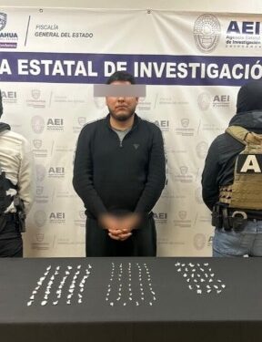 Elementos de la Agencia Estatal de Investigación adscritos a la Fiscalía de Distrito Zona Norte, detuvieron en flagrancia a Lorenzo Antonio G. M., por encontrarse en posesión de 122 envoltorios de dosis de cocaína y cocaína en piedra, cuando tripulaba un vehículo por la colonia Aldama, en Ciudad Juárez.