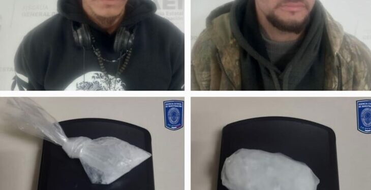 Elementos de la Agencia Estatal de Investigación, adscritos a la Fiscalía de Distrito Zona Occidente, detuvieron en flagrancia a dos hombres en posesión de metanfetamina, droga que también es conocida como cristal, en calles de colonia Lázaro Cárdenas.