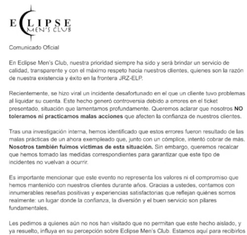 Se disculpa bar Eclipse por cliente exhibido
