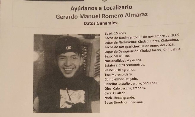La Fiscalía General del Estado (FGE) solicita la colaboración de la comunidad para localizar a Gerardo Manuel Romero Almaraz, un adolescente de 15 años desaparecido en Ciudad Juárez. Fue visto por última vez el 4 de enero de 2025.