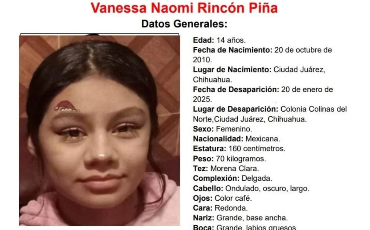 Vanessa Naomi Rincón Piña, de 14 años, fue vista por última vez el pasado 20 de enero de 2025 en la colonia Colinas del Norte, en Ciudad Juárez, Chihuahua, según informa la Fiscalía General del Estado (FGE).