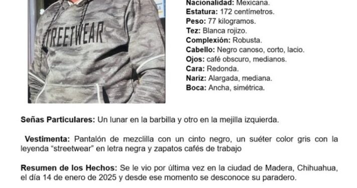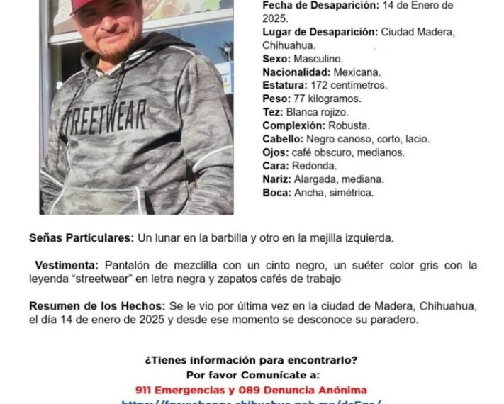 Una vez que se recibió el reporte, los Policías Investigadores procedieron a implementar los protocolos de búsqueda, realizando recorridos en las inmediaciones y cercanías de Ciudad Madera y también en zonas aledañas como son: Ejido la Borrega, Sirupa, Mesa de Parra y en la localidad de Ranchito Santo Niño, sin que hasta el momento sea posible su localización.
