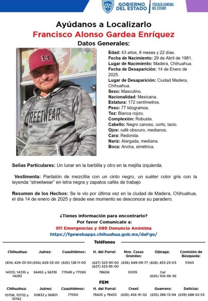 Personal de la Fiscalía de Distrito Zona Occidente, del Destacamento de Ciudad Madera, realizó un operativo de búsqueda para dar con el paradero de Francisco Alonso Gardea Enríquez, de 43 años de edad.
