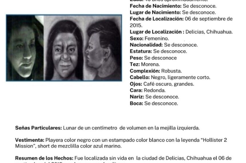 La Fiscalía Especializada en Atención a Mujeres Víctimas del Delito por Razones de Género y a la Familia, solicita la colaboración de la ciudadanía para identificar a una mujer que fue localizada sin vida el 06 de septiembre del año 2015, en un canal de riego del municipio de Delicias.