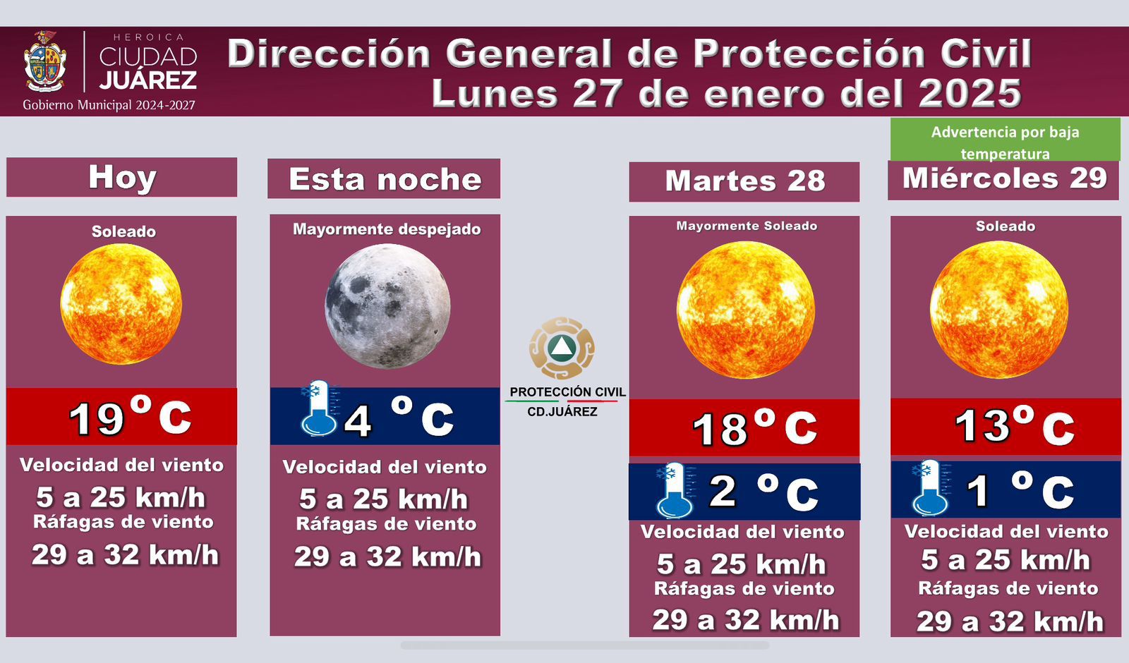 Ciudad Juárez, Chih.- La Dirección General de Protección Civil de Ciudad Juárez informó sobre las condiciones climáticas para los próximos días.