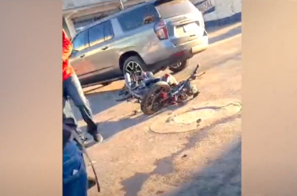 El motociclista, quien duró bastante minutos en el piso y con el vehículo destrozado, fue el responsable del accidente. El sujeto se impactó contra una camioneta Jeep Cherokee de color azul.